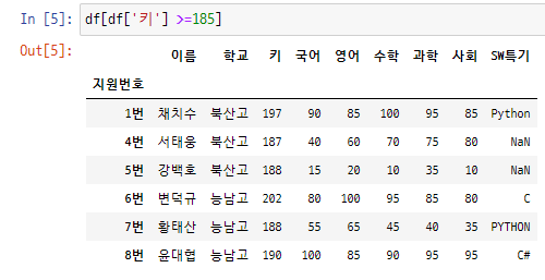 df['키'] >=185라는 부등호를 사용해 입력해 보겠습니다.