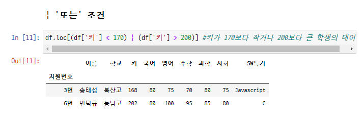 - 아래 예시로, 키가 170 미만이거나 키가 200 초과인 학생의 명단을 구해보았습니다.