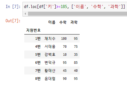 먼저 df테이블에서 키가 185이상인 학생만 필터링하고 그 안에서 이름과 수학, 과학점수에 대한 칼럼을 선택해서 데이터 프레임에 나타내어 줍니다.