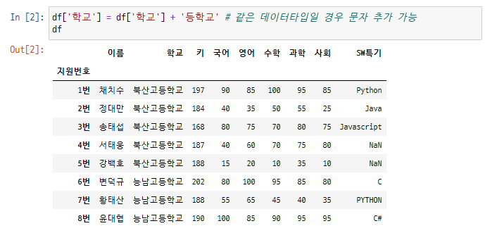 하지만 데이터 타입이 다른 경우, 예를 들어 키에 대한 정보에다 cm를 붇인다던지, 국어 점수에다 '~점'을 붙인다던지 하는 경우는 에러가 발생합니다.