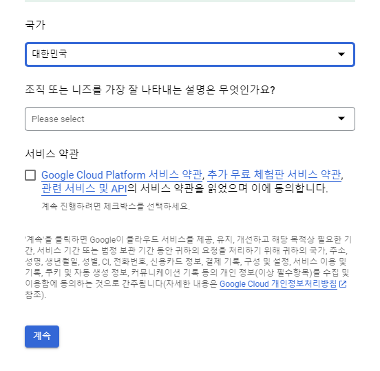 3. 먼저 1단계. 현재 국가와 조직의 정보를 입력한 후 '계속'을 눌러줍니다.