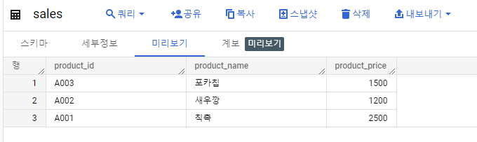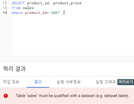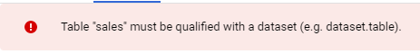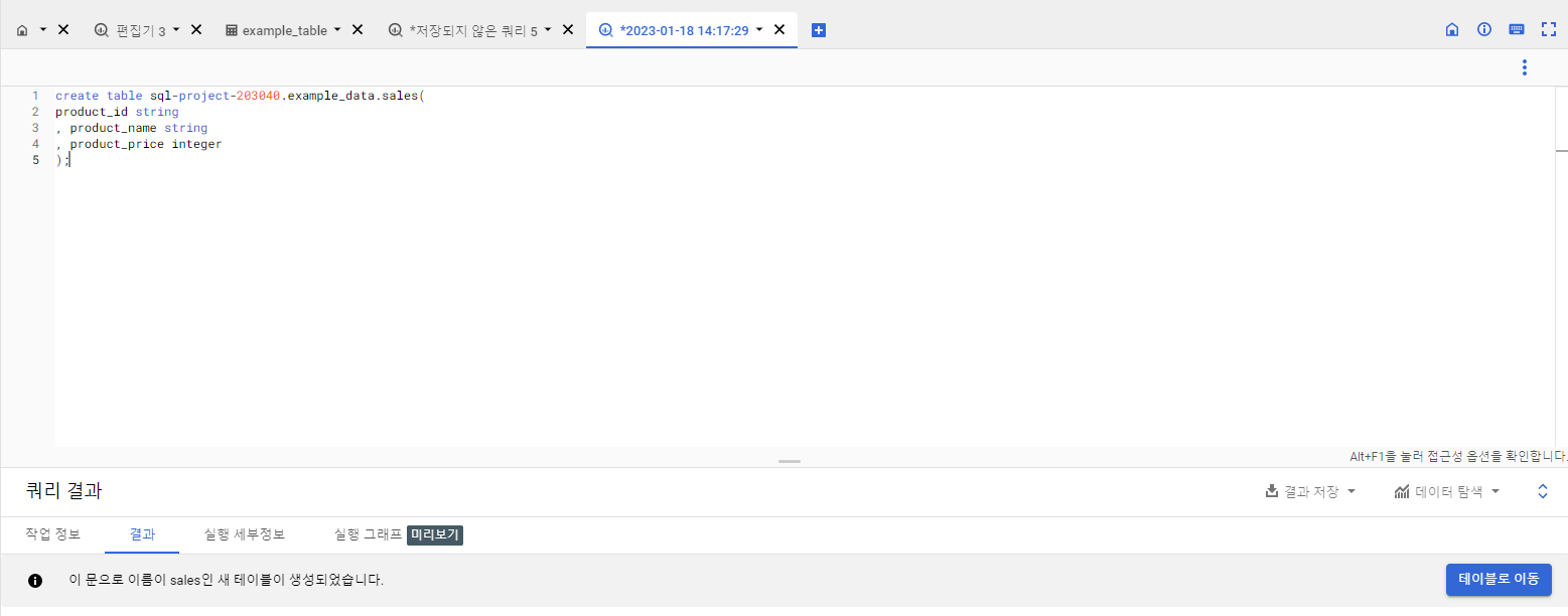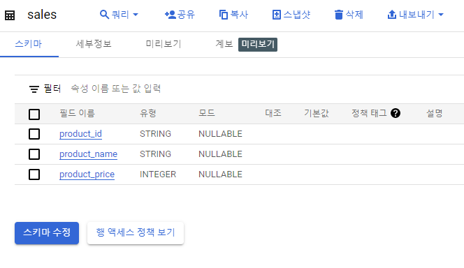 이렇게 바로 create table sales (~~~~)를 하게 된다면 빅쿼리상에서는 이렇게 말할 것입니다.
