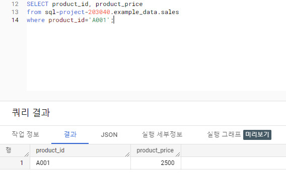 본격적인 분석을 하기 위해 'product_id가 'A001'인 상품의 가격을 알고 싶어서 쿼리를 입력해 보았습니다.