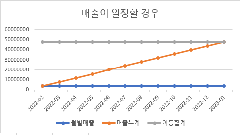 월별매출(월차매출)과 이동합계는 매출이 일정하므로 변함이 없고, 매출누계 역시 일정한 월 매출을 기록하고 있으므로 일정하게 증가하는 모습을 보입니다. 즉, 매우 반듯한 Z모양에 가까운 모습을 보입니다.