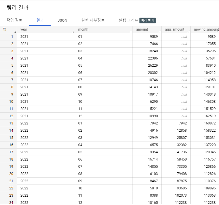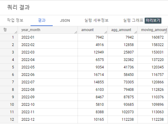 즉, agg_amount칼럼 옆에 이동누계 칼럼 'moving_amount'칼럼을 추가한 것이라 보면 됩니다.