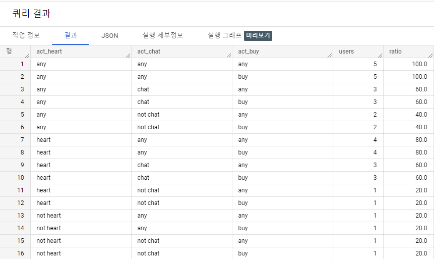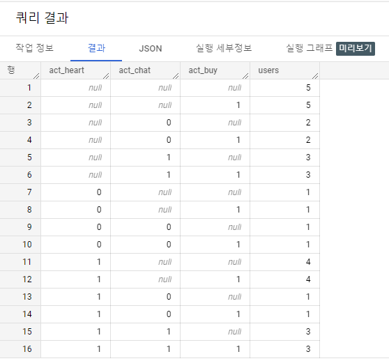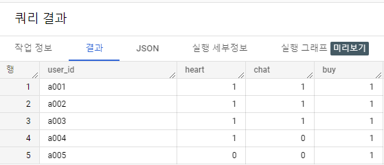 ---- 결과 테이블에서 각 칼럼이 1/1/1일 경우 구매 시 모든 과정을 거쳤다는 의미입니다.