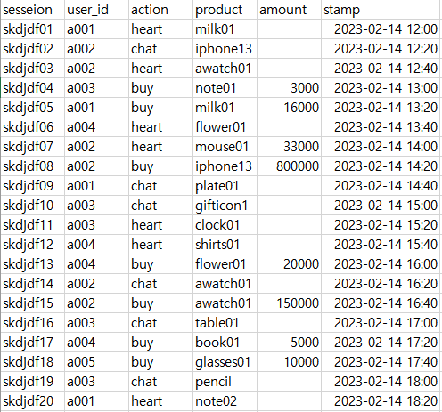 10행에서 좋아요, 채팅까지 하고 구매하지 않은 경우는 3건의 케이스로서, 전체 5명의 유저 중 60%가량을 차지했네요.