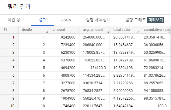 위 쿼리문은 구매액이 많은 순서대로 10등분 그룹화를 시켜준 것입니다.