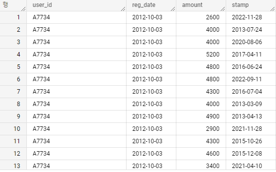 해당 분석에 사용된 테이블은 다음과 같습니다. (테이블 이름: purchase)