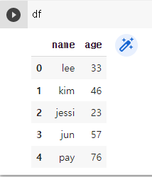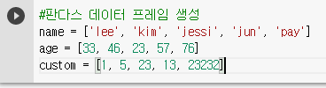다섯 개의 이름과, 나이, 그리고 임의의 숫자를 custom이라는 변수로 두고 리스트 형태로 만들었습니다. 아직까지는 데이터 프레임이 만들어지지 않았고 리스트형태입니다. 그렇기에 데이터 프레임을 만드려면 다음과 같은 추가적인 작업을 진행해야 합니다.
