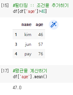pandas패키지를 활용하여 df데이터셋에서 df의 열 중에서 나이가 40이상인 사람만 추출할 수 있습니다.